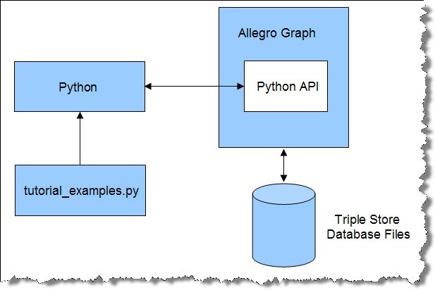 The Python client tutorial rests on a simple architecture involving AllegroGraph, disk-based data files, Python, and a file of Python examples called tutorial_examples.py.
