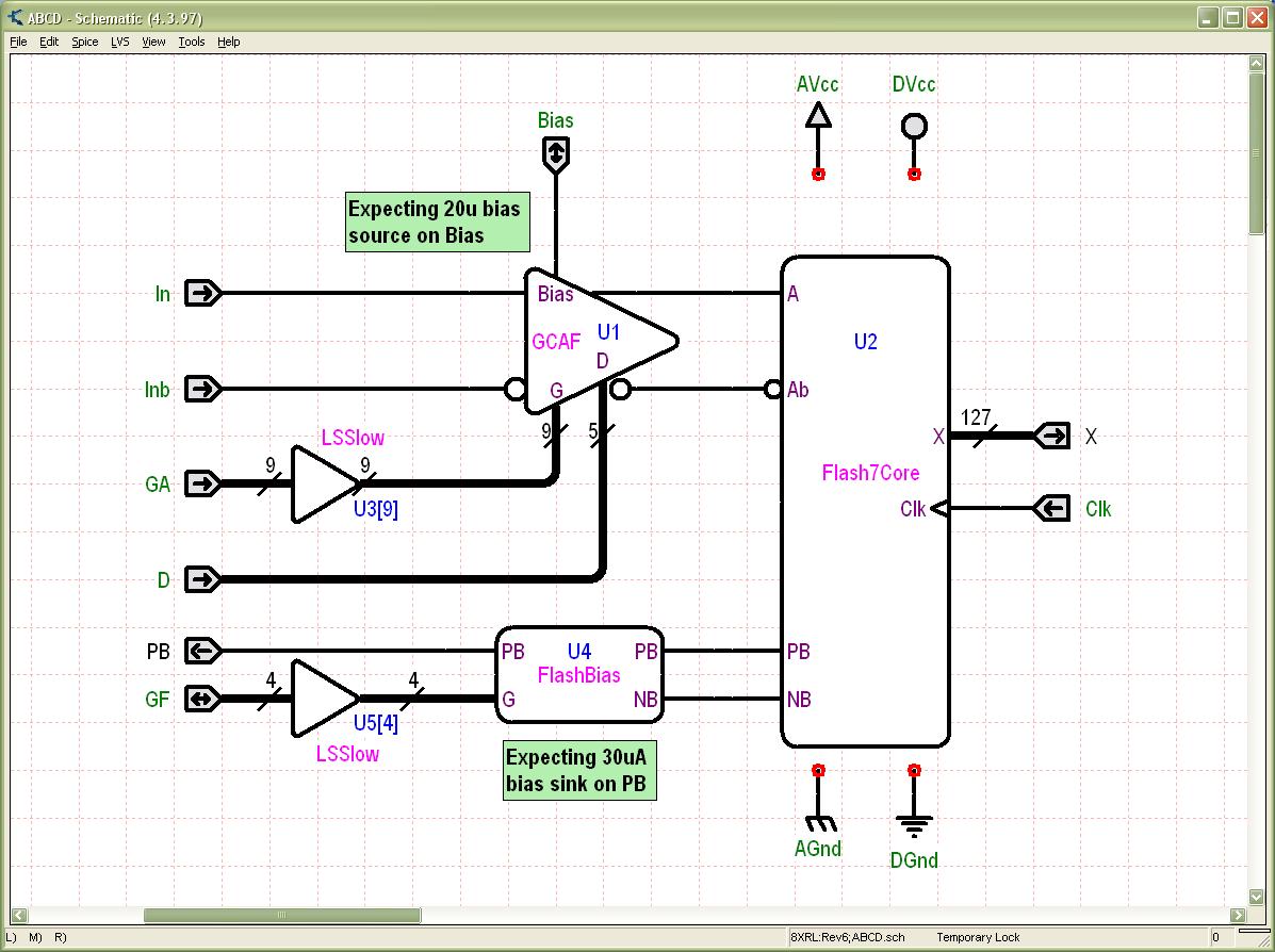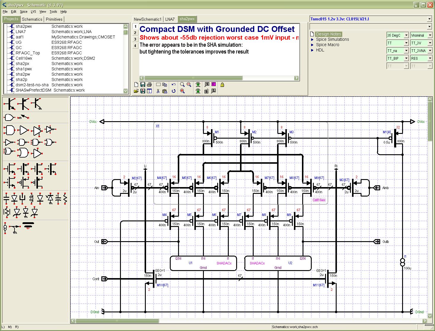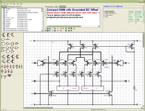 Schemata is a Schematic Entry System – use it to draw and simulate electrical schematics. Schemata is not a prototype or PCB board design tool – it is a capable Analog IC design tool that can be used with most FAB semiconductor processes. The current version performs Spice simulation using Simucad’s SmartSPICE program to which it connects using low level Window’s functions (you need never see the SmartSPICE window) just point and click. Schemata is intimately connected to other MS Windows – all common cut, paste operations etc are supported.