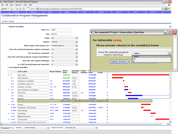 Thumbprint Software uses their innovative interviewing technique, called Process Deliverables Methodology (PDM), to seed an initial library of processes unique to their client's company. The PDM focuses on the end deliverable, unlike common flowchart methods, to capture a client's fundamental operations. These processes then become a starting point for the knowledgebase. That knowledgebase serves as a library that fuels Thumbprint CPM's project generation engine as it automatically assembles project plans from reusable tasks according to user criteria. As the engine encounters various rules and process conditions during automated project assembly, it "interviews" the project manager for any input necessary to navigate decision points. The result is a fully scheduled and resourced project plan unique to the situation yet aligned with overall company program criteria.