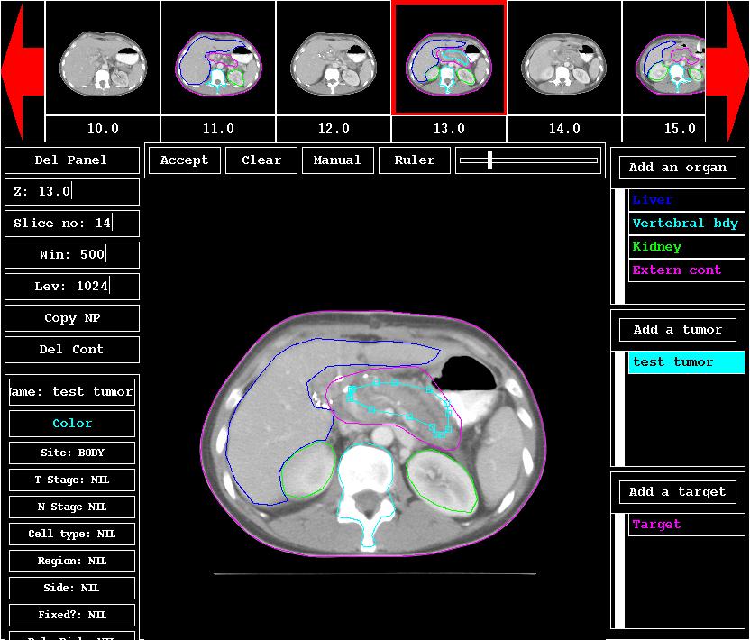 Prism's user interface makes available as many operations as possible to the user at all times. This goal is accomplished, according to Kalet, by "associating a type of control panel or object editor with each type of object that the user can create or modify." The user interface contains a screen window that includes controls such as dials for angles, sliders for adjustable numbers, text input boxes, for targeted text, etc. When the control panel for an object displays, the user can modify any of the attributes of that object on-the-fly. A patient administrative information panel, as well as individual panels for treatment plans and radiation beams, complete the amount of user-accessible information available at time of treatment. Additionally, "view windows display graphical renditions of patient anatomy and beam portals," says Kalet, "and a graphic editing panel provides for the delineation and modification of patient anatomy, tumors, and targets. Prism allows the user to bring up simultaneously any number of these or other component-specific panels during the session."