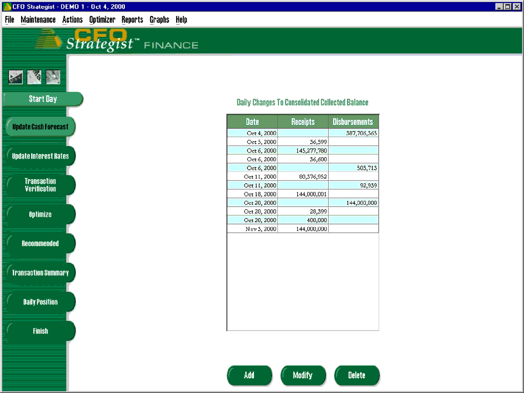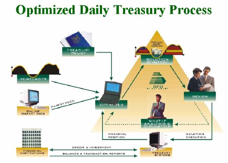 On a daily basis, corporate treasurers must assess the financial situation of the company, analyze possible investment or debt scenarios and choose the best set of transactions to ensure the right amount of cash is on-hand. Wisdom's product can quickly analyze an extensive range of possibilities and recommend the best course of action to minimize borrowing cost or maximize investment return over a selected time period.