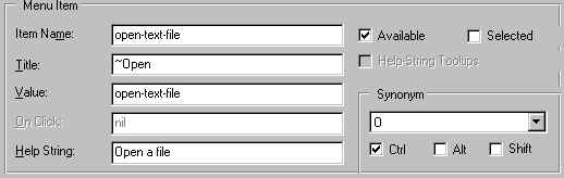 The Menu Item pane, at the bottom of the Menu Editor, allows you to specify the details of the entries in the Menu group. The details of the selected entry in the Menu Pane are displayed in the Menu Item pane and changes affect that entry only. Only one entry can be selected at a time. Here is the Menu Item pane from the default menus (i.e. the File and Edit menus displayed when the Menu Editor first appears) with the third (~Open) entry selected: