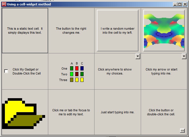 Here is a more complex example Grid-widget: using built-in cell widgets in ARBITRARY cells.