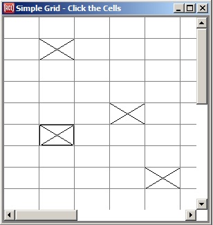 Here is Grid-widget: the simplest possible grid-widget-example. A simple grid. Left click on a cell and an X is marked (as we have done with several). Right click and the X goes away. Note the scroll bars. The widget is bigger than the window displaying it.