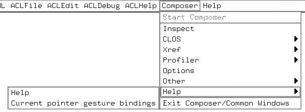 You interact with Allegro Composer using Emacs menus, particularly the ACL/Composer menu. Once Allegro Composer is started, the items in that menu will be available.