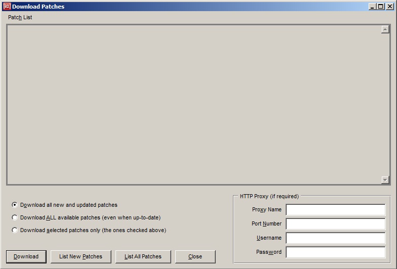 Pressing the List New Patches Now button will show the Download Patches dialog and will automatically press its List New Patches button. You can then press that dialog's Download button to download the listed patches, or just close the dialog to do nothing.