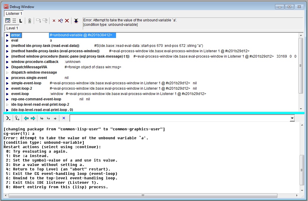 Clicking on Abort will cause the error to be unwound. Clicking on Debug changed the display of the Debug window to look like this, with the listener below and the debugging pane above: (click here to see the description of the listener in the Debug window):
