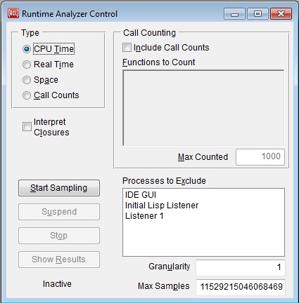 The radio-buttons at the upper left indicate the basic type of runtime analysis data to be collected, depending on whether you are interested in what code is taking most of the time (a CPU Time or Real Time analysis), what code is doing most of the consing of new objects (a Space analysis), or which functions are getting called frequently (Call Counts analysis).