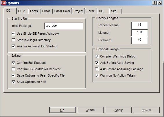 Changes that you make using the Options dialog (or the configuration object) are saved to the file allegro-ide-options.cl when the Tools | Save Options Now command is used, or when the IDE is exited if the Tools | Save Options On Exit option is enabled (as it is by default). When you restart the IDE, it will be configured as it was when options were most recently saved.