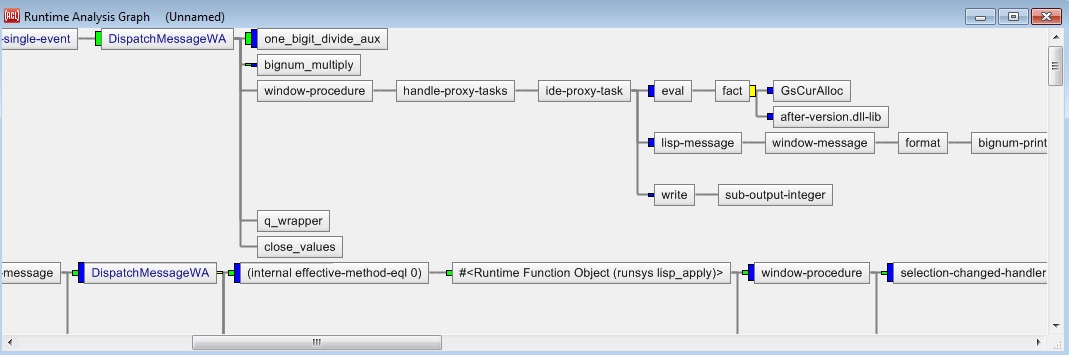 Clicking the Graph button presents the information from the Outline presentation as a tree graph. The blue bars on the left side of the graph nodes indicate the portion of the time spent (or space consed) in the node's branch as a fraction of the time spent in the parent node's branch. If the blue bar is as tall as the node itself, that indicates that 100% of the time in the parent branch was spent in this branch; a blue bar half as tall as the node indicates that 50% of the parent branch was spent in this branch. If there is a green bar, that indicates the portion of the entire analysis time that was spent in this node's branch. The yellow bar on the right side of a node indicates the portion of that node's branch that was spent within that node itself, as opposed to its sub-nodes; in other words, the portion of hits that occurred within that function itself rather than in the functions that it called. The yellow bars are not drawn on the leaf nodes since they would always be the full node height on those nodes.