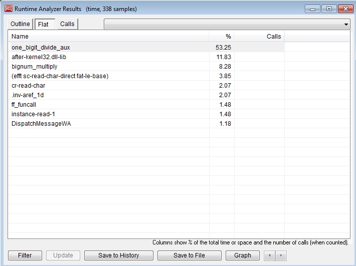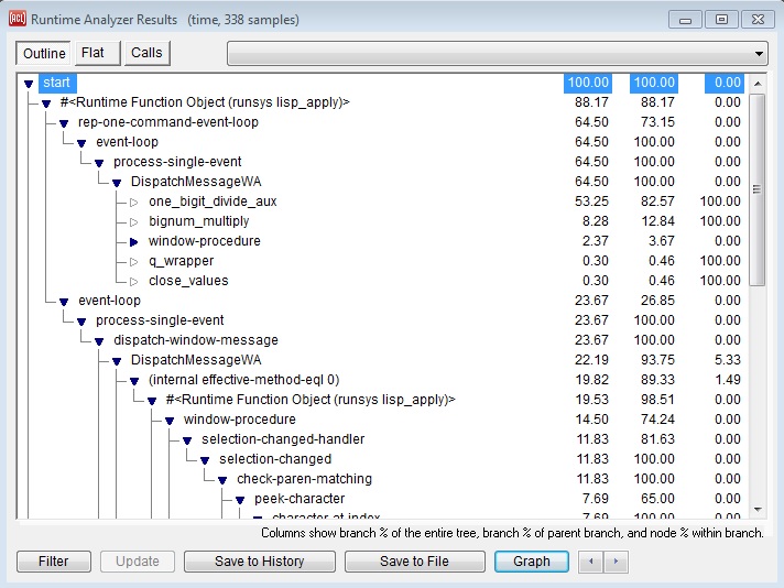 The three tabs summarize the collected data in up to three ways. Illustrated above is the Outline presentation (onthe Outline tab), which corresponds to the output from show-call-graph, and the Flat presentation (on the Flat tab), which corresponds to the output from show-flat-profile.