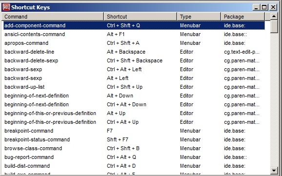 The Type column indicates whether each command is defined on the IDE's menu bar, or by the editor's current comtab (command table), or as a global shortcut. The menu bar keystrokes are applicable in a variety of IDE windows, while the editor keystrokes are applicable only in editor and listener panes. A different set of editor commands, with different keystrokes, will appear in this list depending on the current editor comtab (see editor-mode). Global shortcuts are defined with add-global-keyboard-accelerator.