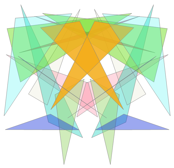 This example simply generates a set of random triangles and fills them with random colors that use random amounts of alpha blending, and adds bilateral symmetry. Clicking the window generates another image. The alpha blending works only on the Windows platform, but the code runs elsewhere.