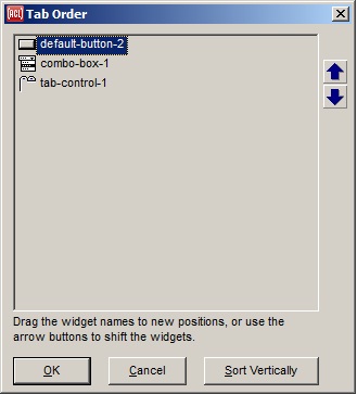 Displays a Tab Order dialog allowing you to specify the tab order of controls on the current form. When the form is run, pressing tab will move focus among controls. The order in which focus moves among controls can be set by this dialog. See tab-position.
