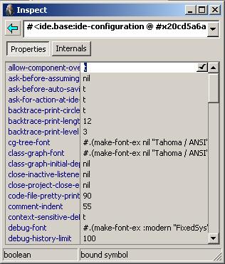 Your preferences about window arrangement, choice of fonts, editor mode, and so on are stored in a file in the Allegro folder (where Allegro CL was installed) called prefs.cl. This file is updated when you exit Allegro CL (unless the menu command Tools | Save Options on Exit is toggled off), incorporating changes made using the Options dialog (displayed with Tools | Options) and when you make direct changes to the configuration using the Inspector as described just below. Deleting or renaming prefs.cl (and deleting prefs.fasl if it exists) will cause the IDE to revert to the initial default settings.