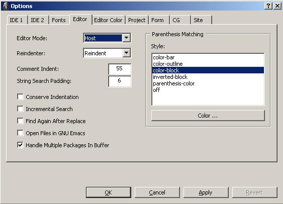 Files will be opened in Emacs (rather than the IDE Editor Workbook) if the Open Files in GNU Emacs option on the Editor Options pane is selected and Emacs is running and linked to Lisp. (The illustration just below shows the Editor Options pane with the Open Files in GNU Emacs option not checked.)