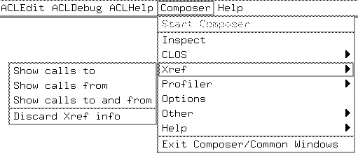 There are a number of Emacs menus associated with Allegro CL that are submenus of the ACL menu, including File, Edit, Debug, and Composer. When Allegro Composer is started, the ACL/Composer Menu items become available. (More precisely, before Allegro Composer is started, only the Start Composer item is available. After Allegro Composer is started, that item becomes unavailable, and the remaining items become available.