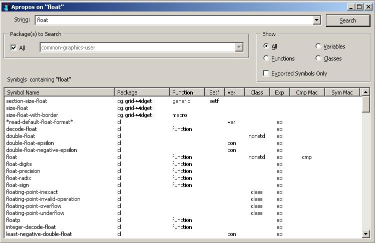 If All is selected, all symbols fitting other criteria (contain string, accessible in package) are displayed. If Functions is selected, just those symbols naming functions (or generic functions or macros) are displayed. If Variables is selected just those symbols that have a value are displayed. If Class, just those naming a class. Changing the Show field causes the display to be updated immediately. Note that a single symbol can name a function, a variable and a class.