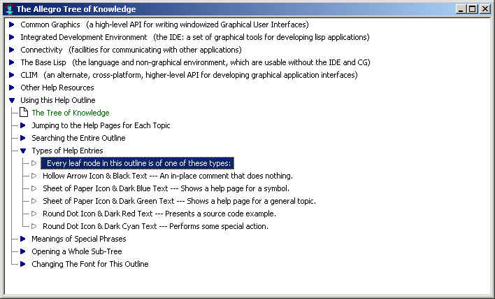 This dialog displays an outline of the available Common Graphics/Integrated Development Environment documentation and much general Allegro CL documentation. Double-clicking on a leaf item (i.e. one that does not have subitems), or pressing the SPACE bar or the F1 key while the leaf item is selected, displays the relevant documentation, typically the relevant page in this help file, but Navigator examples are also displayed by some leaf entries.