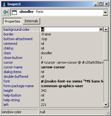 The buttons at the top (in the illustration, Properties and Internals, other objects may have more or different buttons), indicate what pane of the window is visible. In the illustration, the Properties pane is visible and the button looks pressed. Properties are usually changeable aspects of the object while Internals should not normally be modified. Controls have an Events button listing the event functions called when certain mouse events occur over the control.