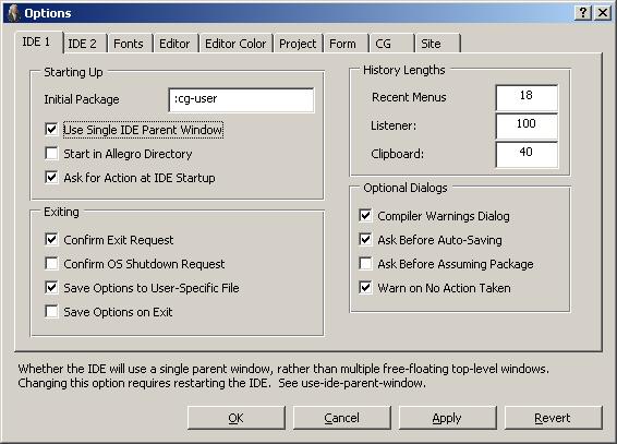 Changes that you make using the Options dialog (or the configuration object) are saved to the file prefs.cl when the Tools | Save Options Now command is used, or when the IDE is exited if the Tools | Save Options On Exit option is enabled (as it is by default). When you restart the IDE, it will be configured as it was when options were most recently saved.