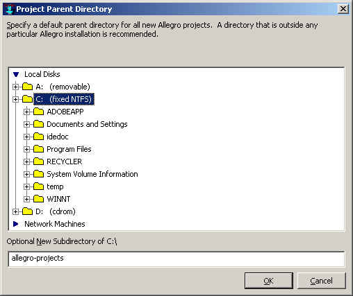 There is a default parent directory for project directories. That default is chosen by this dialog, which is displayed the first time a new project is created. The directory specified that first time is used as the default when new projects are created later. The default location is C:\allegro-projects, as shown in the illustration.
