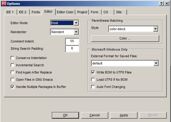 Editing (other than using Emacs) should be in text-edit windows or panes, such as the Debug window and the Editor Workbook (which has tabs for different editor buffers). The editing mode for text-edit windows can be Host, Emacs, or Brief. The mode is set in the Editor tab of the Options dialog (displayed with Tools | Options). Here is that dialog. The Host mode is chosen: