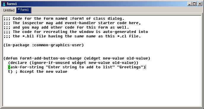We will be adding code for event handlers for controls on the form in this buffer presently. (Note: if we do not display this buffer before we start editing event handling code, the initial event handling function code is stored in a hidden buffer. Then when this form1 buffer is used, redefinition warnings will be displayed when the code is compiled. Such warnings, if they appear, may be safely ignored.)