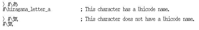 > (format t "u+~4,'0x" (char-code #\latin_capital_letter_a)) u+0041 > (format t "u+~4,'0x" (char-code #\A)) u+0041