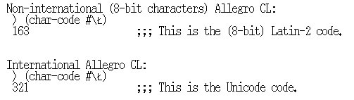 Characters from other sets, however, may have different values in Unicode. For example, the Latin-2 character "Latin Capital Letter L With Stroke" has value #xa3 in Latin-2 (ISO 8859-2), but has value u+0141 in unicode [we use the 'u+xxxx' convention here for describing unicode values; 'xxxx' is in hexadecimal format]. Thus, programs which depend on character code values of non-Latin-1 characters may need to be examined and possibly updated to operate with Allegro CL. Users with existing Allegro CL programs who do not wish immediately to update their programs will be able to use the non-international, 8-bit character based, Allegro CL which does not use Unicode to represent characters.