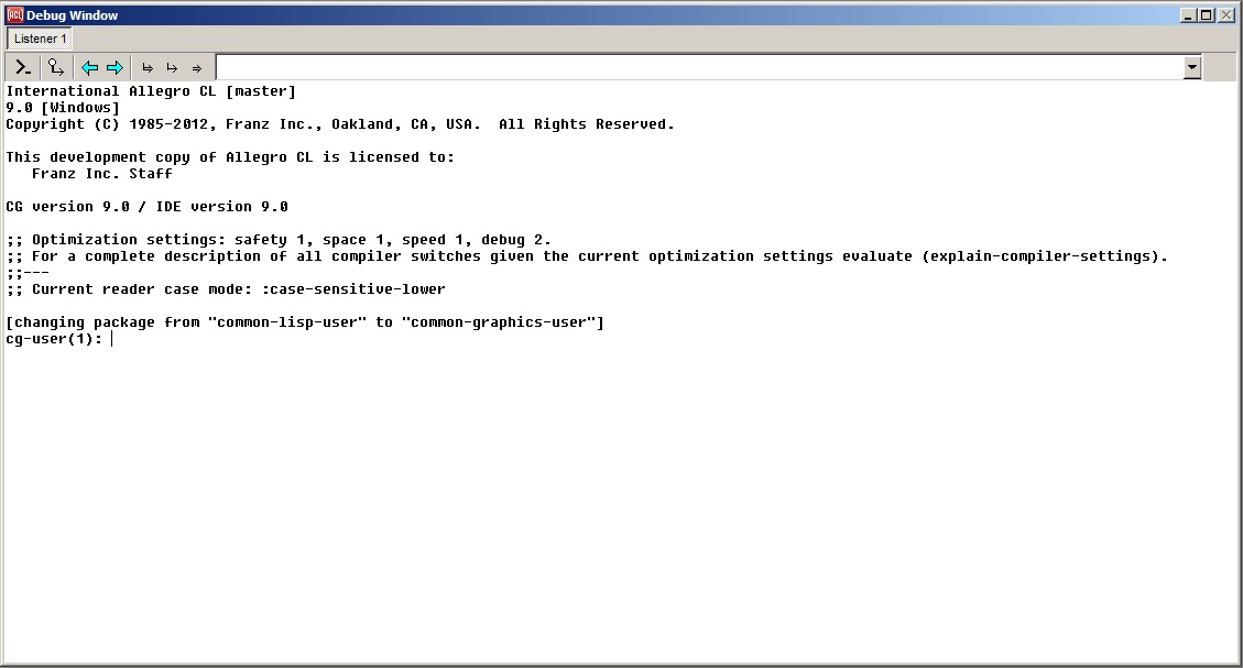 The Debug window contains a listener (with a prompt) where you can enter and evaluate Lisp forms. It also displays debugging information after an error (click here to see the description of the Debug window after an error). Here is the Debug window when there is no error being debugged: