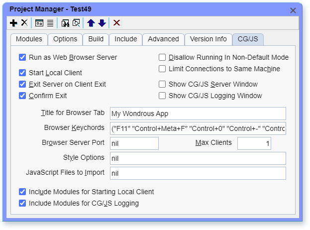 This tab on the Project Manager dialog specifies project options that pertain to running the application in a web browser (also known as CG/JS mode).