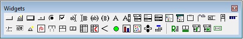 Displays the Widget Palette, which is a small window containing buttons for the various kinds of widgets that you can add to a form window to design a dialog interactively. To add a widget to a form, first click the button for the desired type of widget in the palette, and then click on a form to add an instance of that type of widget to the form. Alternately, use Form | Add Component.