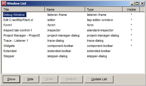 Windows on this menu will include forms and their running windows when the Run | Run Form command is used, any windows created programmatically by the user in the IDE when the parent arg defaults to (development-main-window system), and some of the standard IDE dialogs when the usual command for invoking the dialog causes effects other than simply exposing the dialog. The right-click shortcut menu on the IDE Background Window (when it is present) continues to list the windows that are accessible from the Windows menu as well as from other pull-down menus (especially the View menu), since it is an alternative to using the menubar altogether.