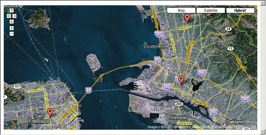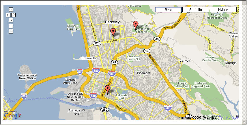 The first two entries in the example are street addresses while the third specifies a latitude and longitude directly. The first string in every entry is a label to display when the user moves the mouse cursor over the marker for that location. When a street address (or a more general indicator such as "Oakland, CA") is specified, a Google service is used to convert the address to a latitude and longitude. The set of all requested locations will be centered in the map, and the maximum zoom level that can display all locations simultaneously will be used.